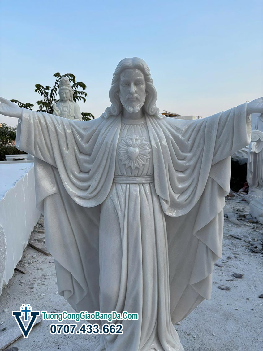Tượng Chúa Giang Tay bằng đá trắng tự nhiên nguyên khối (cao 1,3 mét) là một trong những mẫu tượng Công Giáo được ưa chuộng nhất hiện nay, đặc biệt phù hợp đặt tại sân vườn nhà thờ, khuôn viên giáo xứ hoặc không gian tâm linh gia đình. Sản phẩm được chế tác thủ công tinh xảo tại xưởng điêu khắc đá Công Giáo Văn Vĩnh, đảm bảo cả về giá trị thẩm mỹ lẫn ý nghĩa thiêng liêng.