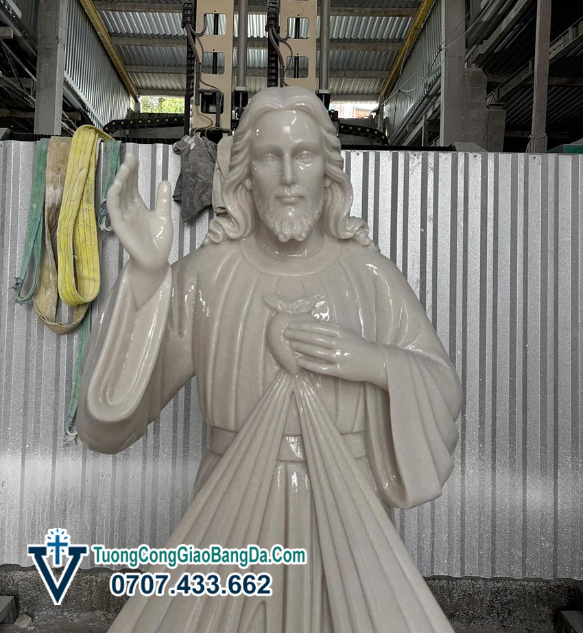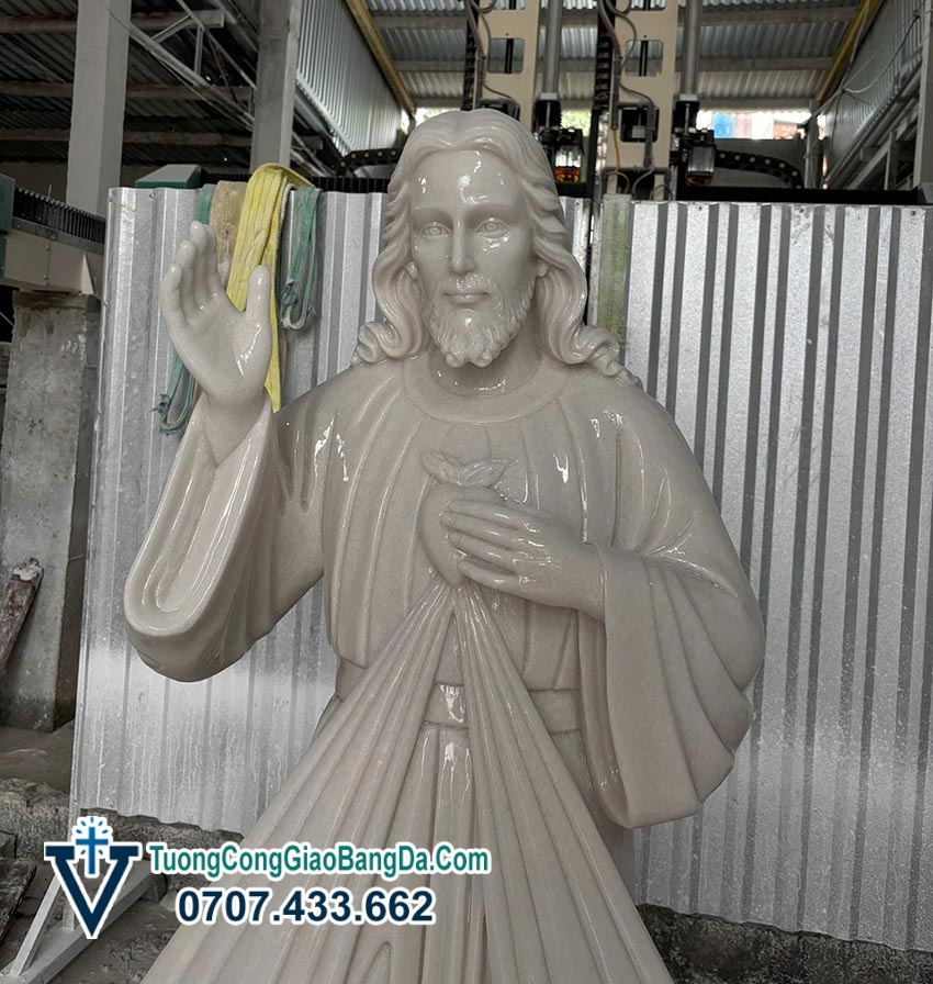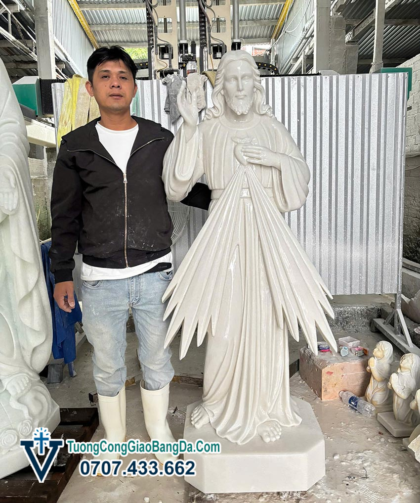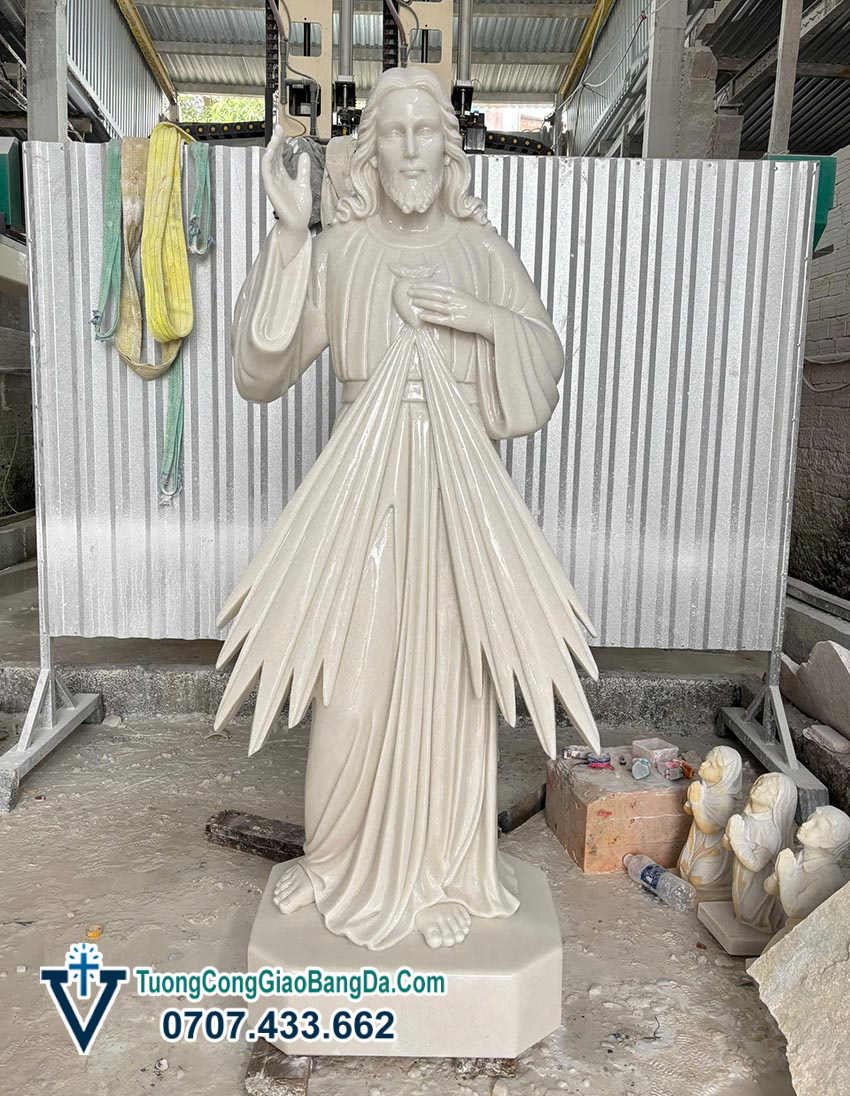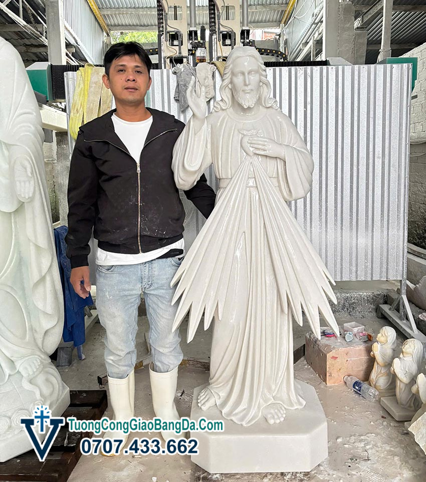 Tượng Chúa Giêsu trong hình tượng Lòng Chúa Thương Xót là một trong những mẫu tượng Công giáo rất được tôn kính và phổ biến tại các nhà thờ, nhà nguyện và gia đình Công giáo. Mẫu tượng trong hình được chế tác từ đá cẩm thạch tự nhiên, cao 1,7 mét, do các nghệ nhân của Xưởng Điêu Khắc Tượng Công Giáo Bằng Đá Văn Vĩnh thực hiện với kỹ thuật điêu khắc tinh xảo và độ hoàn thiện cao.