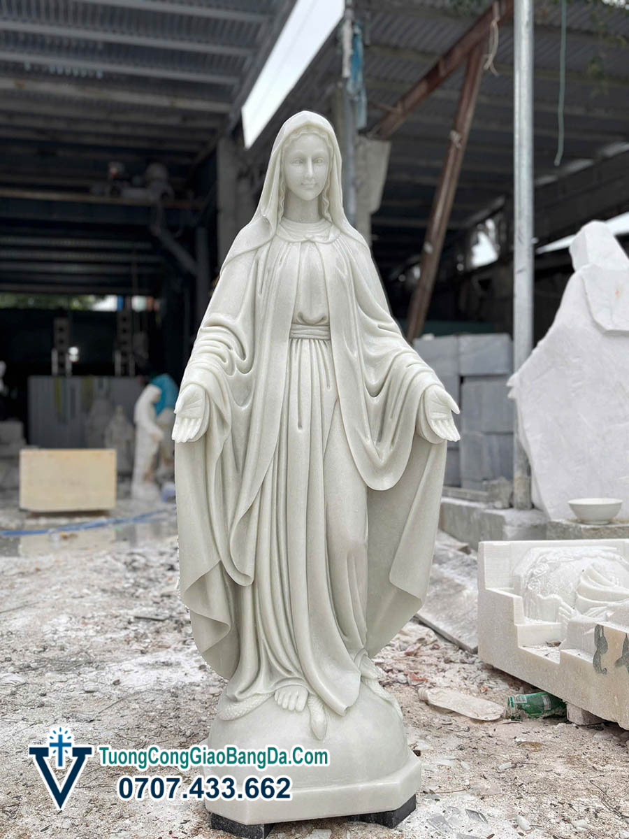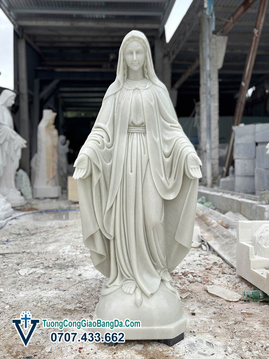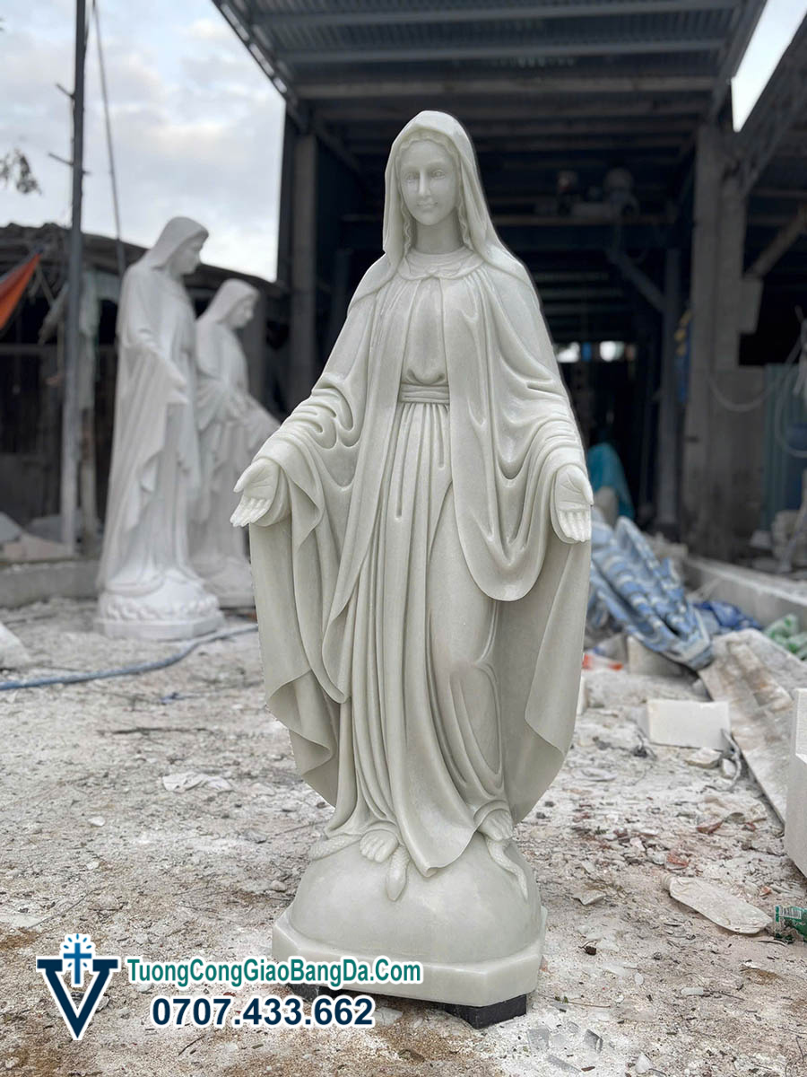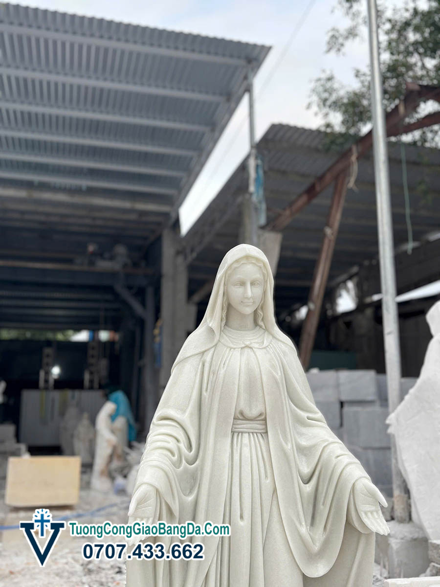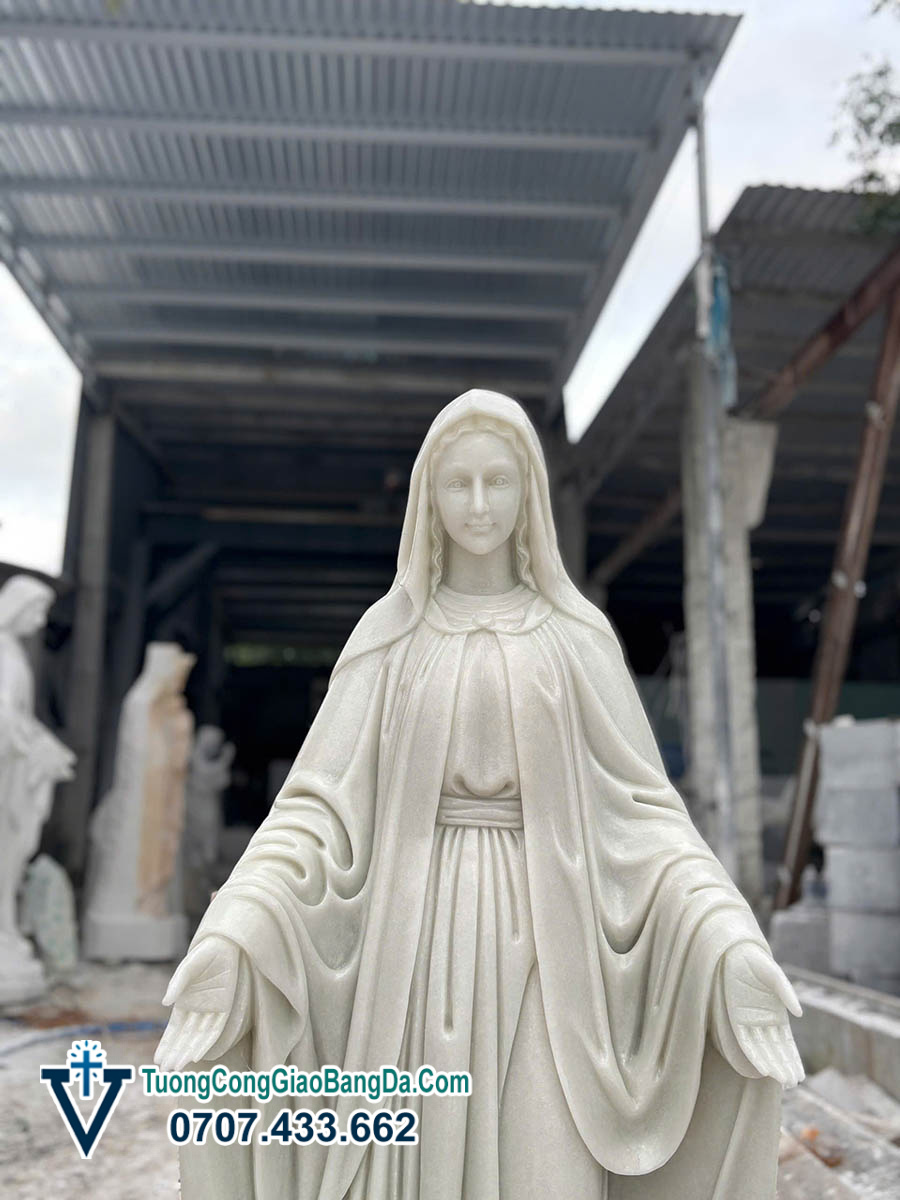 Tượng Đức Mẹ Ban Ơn bằng đá tự nhiên, cao 1,2 mét, được điêu khắc thủ công tại Xưởng điêu khắc tượng Công Giáo bằng đá Văn Vĩnh, là mẫu tượng mang vẻ đẹp thanh thoát, hiền từ và đầy tính thiêng liêng, rất phù hợp cho việc tôn kính trong đời sống đức tin Công Giáo.