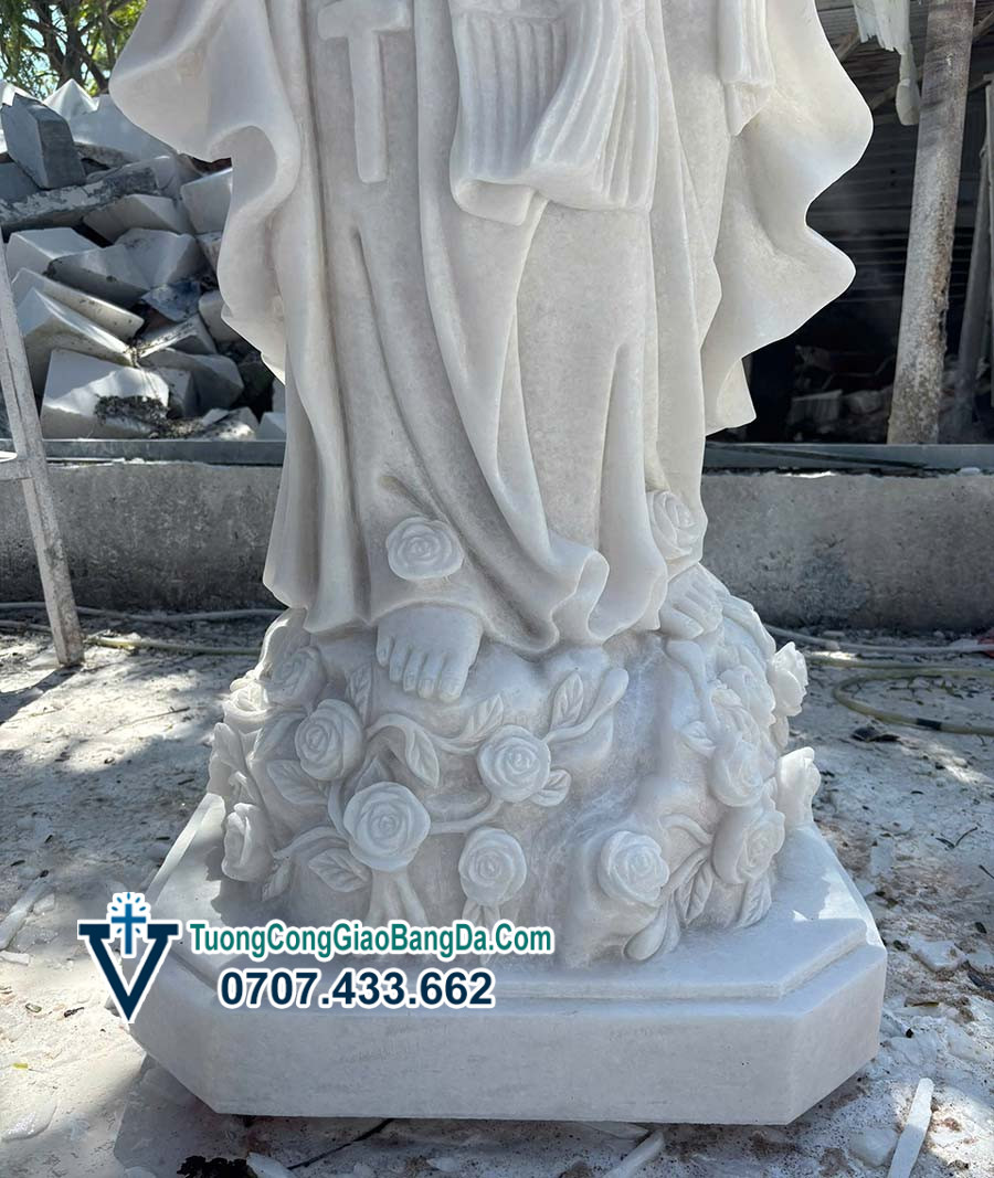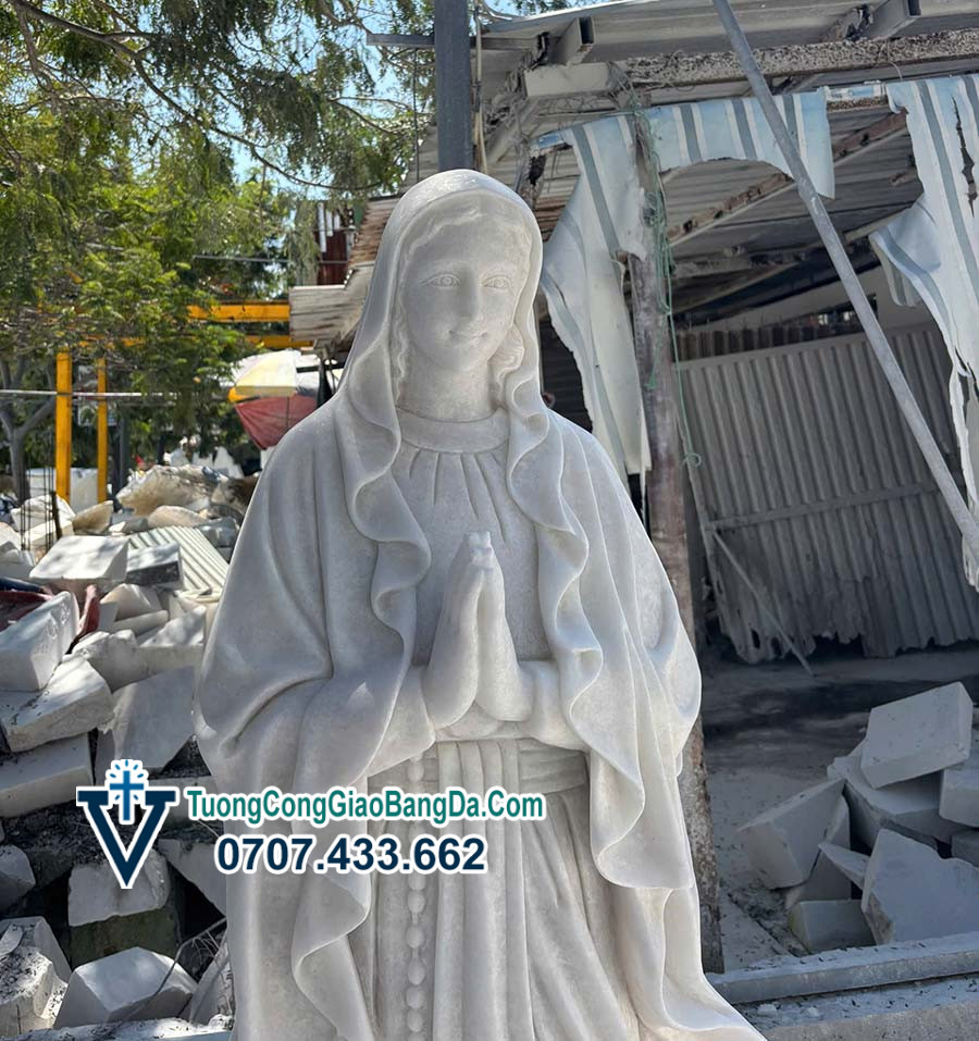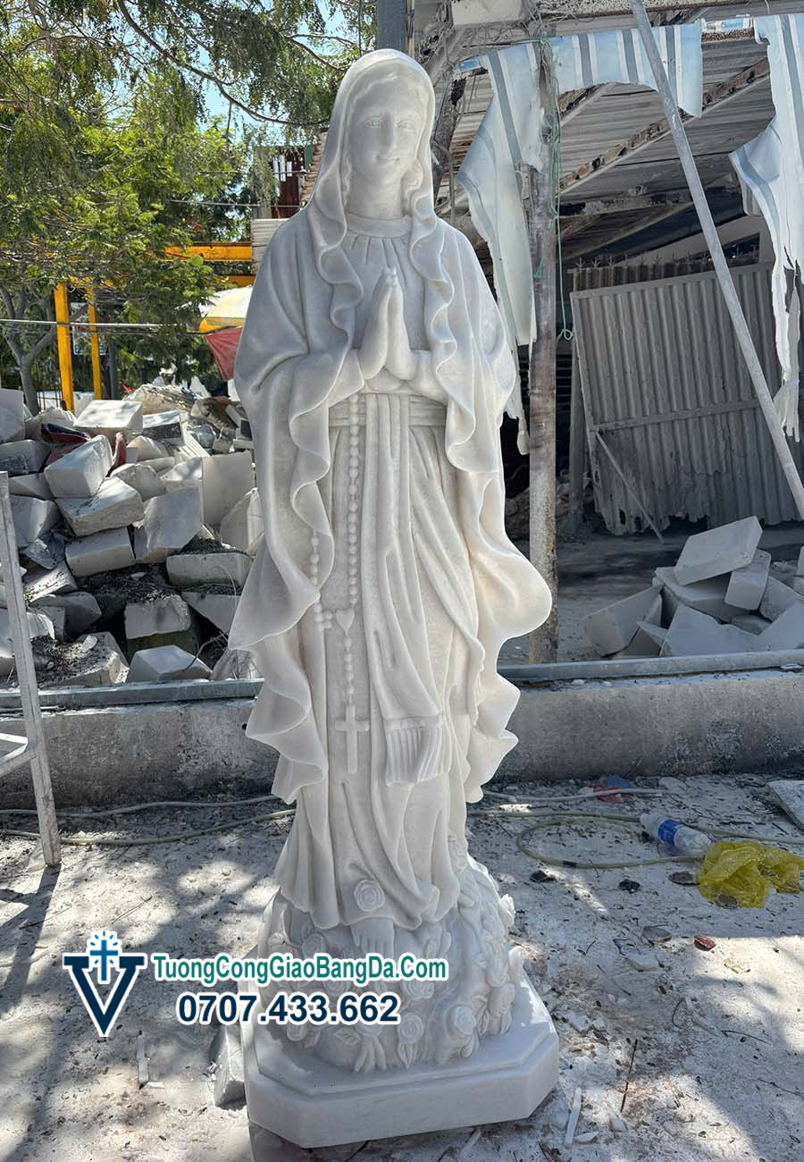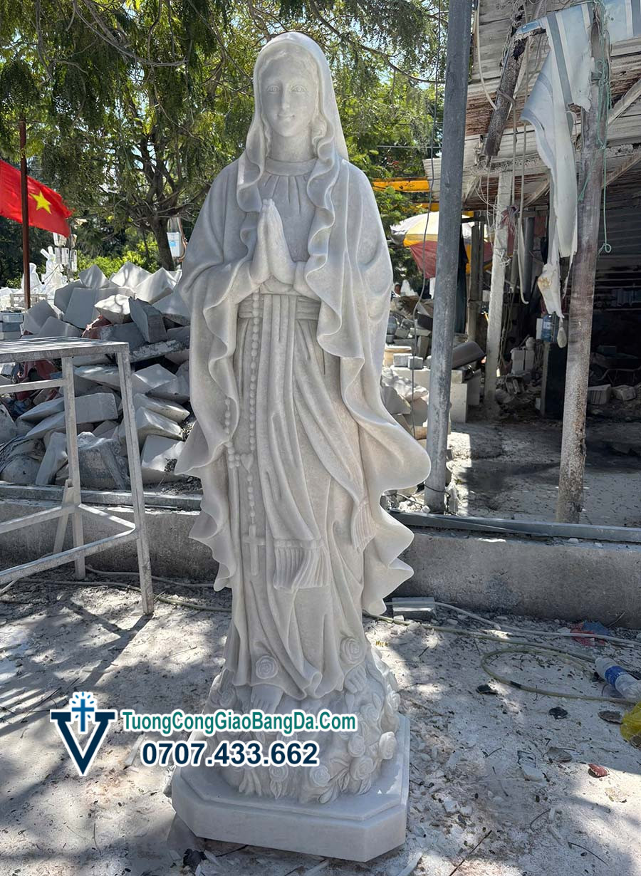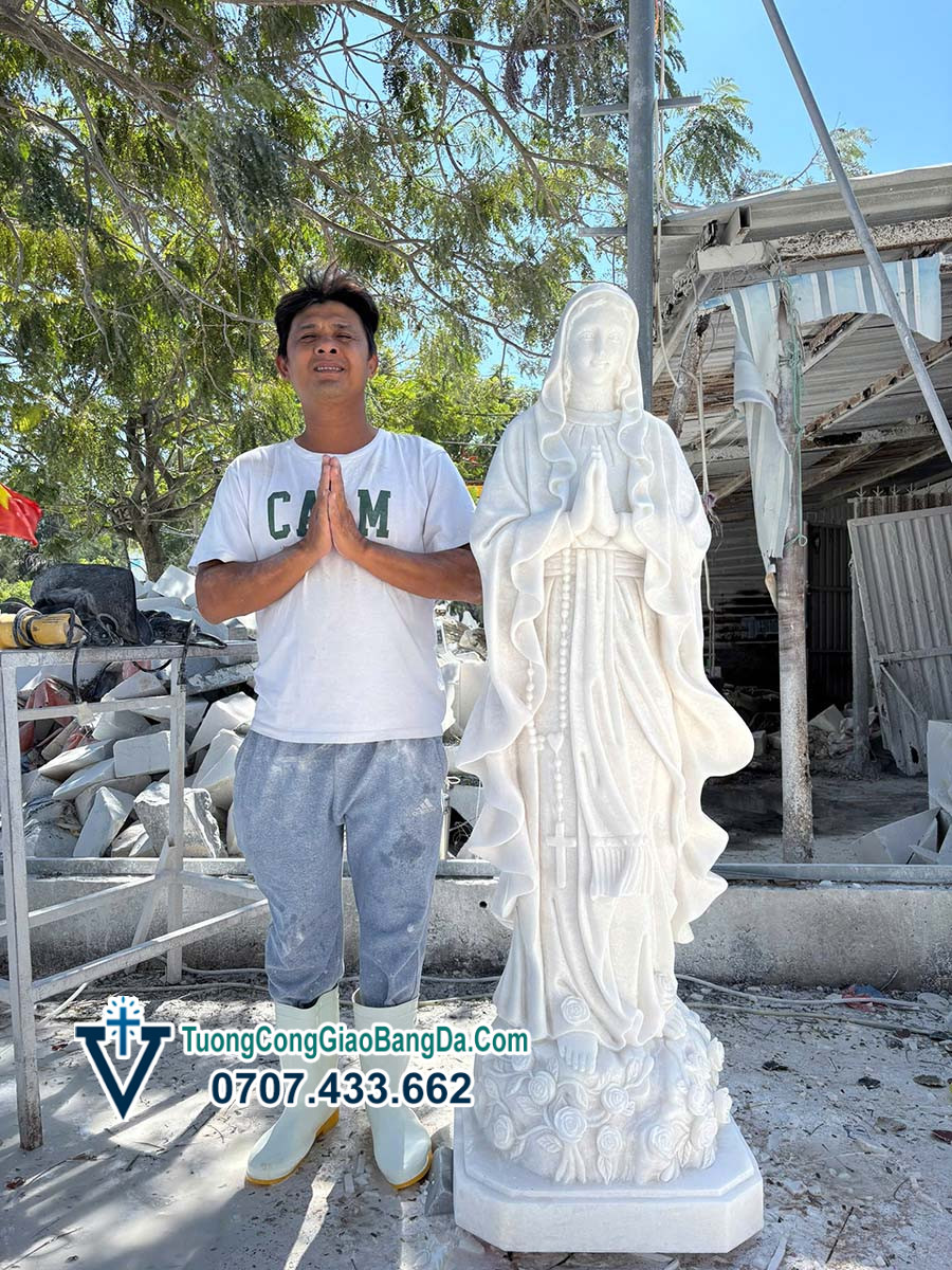 Tượng Đức Mẹ Lộ Đức cao 1,6 mét được chế tác từ đá cẩm thạch trắng tự nhiên, khai thác từ mỏ đá có độ cứng tốt, vân đá đẹp và khả năng chịu thời tiết cao. Sản phẩm được điêu khắc tại Xưởng Điêu Khắc Tượng Công Giáo Bằng Đá Văn Vĩnh, nơi chuyên thực hiện các tác phẩm tượng tôn giáo theo chuẩn mỹ thuật – thần học – tôn kính của Giáo Hội.