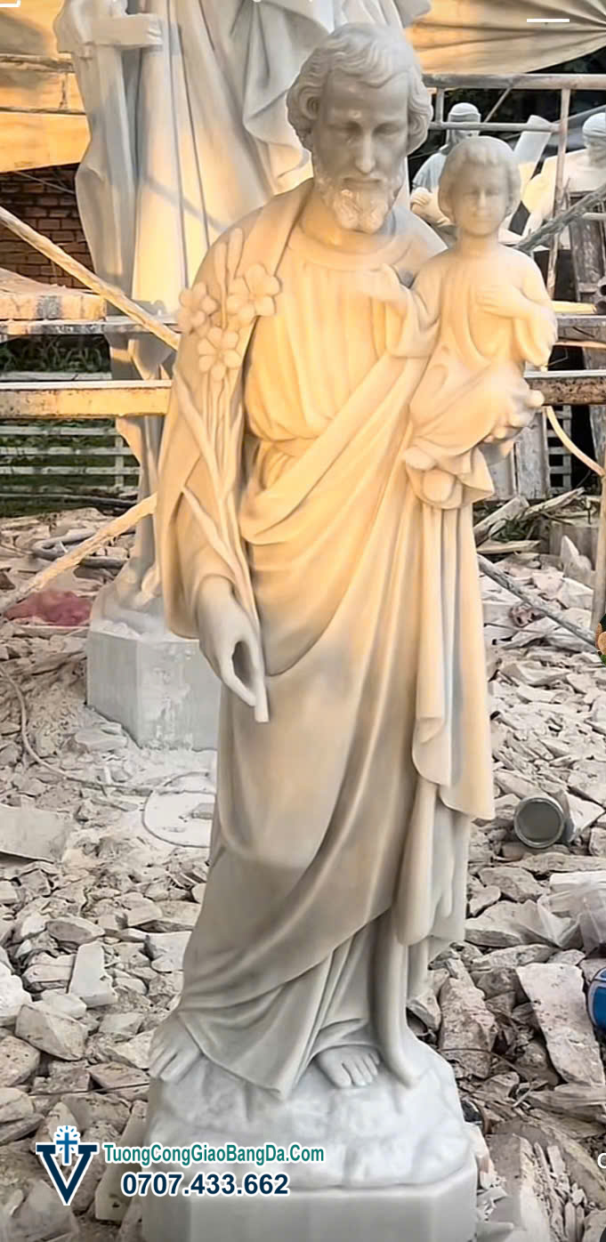 Tượng Thánh Giuse bế Chúa Hài Đồng bằng đá tự nhiên trong hình là tác phẩm được điêu khắc công phu tại xưởng điêu khắc Tượng Công Giáo bằng đá Văn Vĩnh, thể hiện vẻ đẹp trang nghiêm, ấm áp và giàu ý nghĩa thiêng liêng, rất được ưa chuộng trong các công trình Công Giáo.