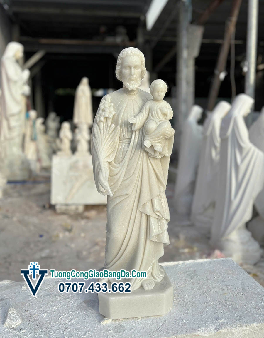 Tượng Thánh Giuse bồng Chúa Hài Đồng bằng đá cẩm thạch trắng là một trong những mẫu tượng Công Giáo được nhiều gia đình, nhà thờ và cộng đoàn lựa chọn nhờ vẻ đẹp trang nghiêm, tinh tế và giàu ý nghĩa thiêng liêng. Mẫu tượng cao 70cm, được điêu khắc thủ công tại Xưởng Điêu Khắc Tượng Công Giáo bằng đá Văn Vĩnh, nơi nổi tiếng với truyền thống chạm khắc đá mỹ nghệ Công Giáo lâu đời.