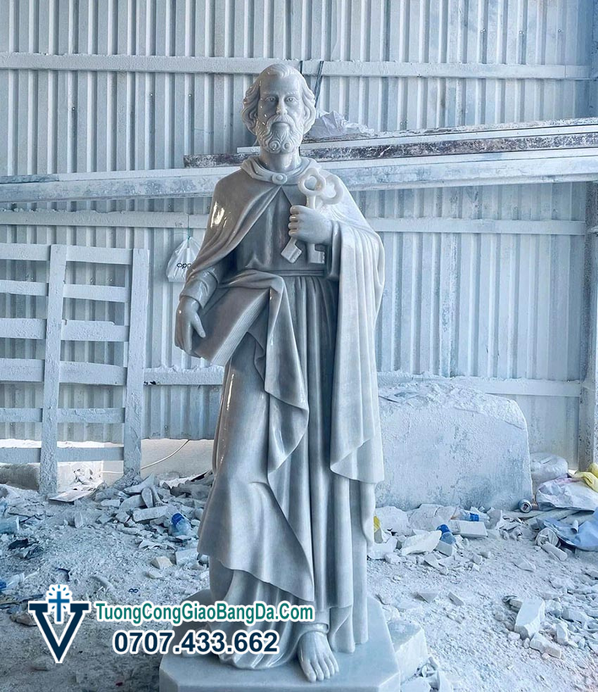 Tượng Thánh Phêrô bằng đá cẩm thạch nguyên khối cao 1,6 mét là một trong những mẫu tượng Công Giáo được chế tác tinh xảo, mang ý nghĩa thiêng liêng sâu sắc trong đời sống đức tin của người Kitô hữu. Tác phẩm được điêu khắc thủ công tại xưởng điêu khắc tượng Công Giáo bằng đá Văn Vĩnh, sử dụng chất liệu đá cẩm thạch tự nhiên cao cấp, đảm bảo độ bền vững lâu dài và vẻ đẹp trang nghiêm.