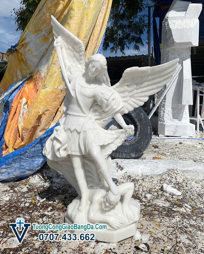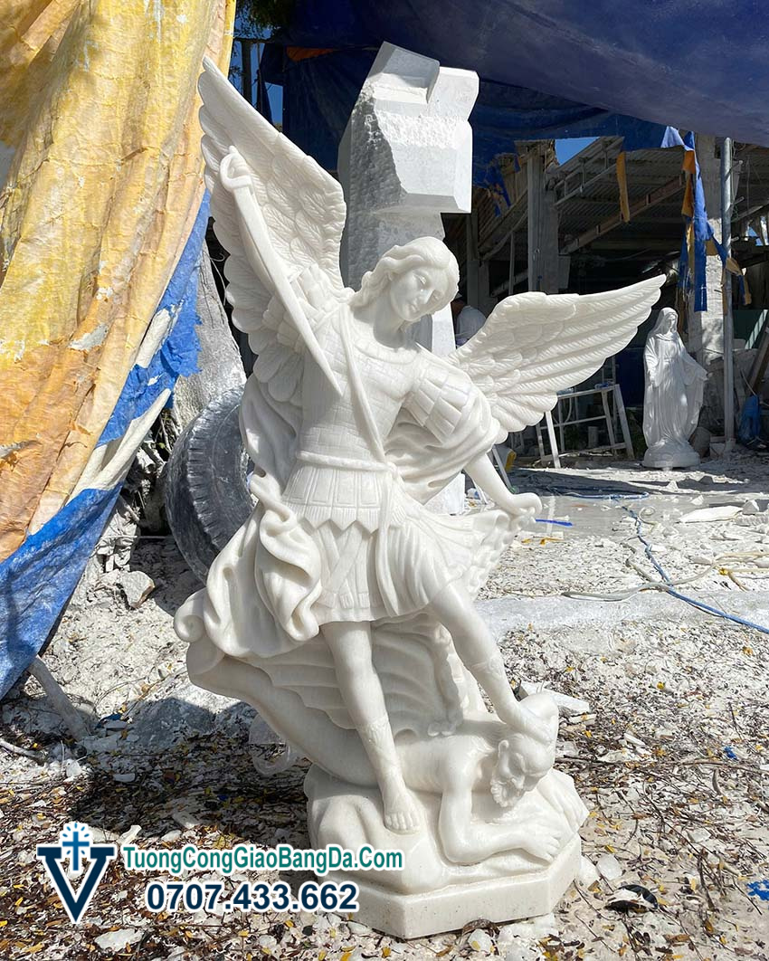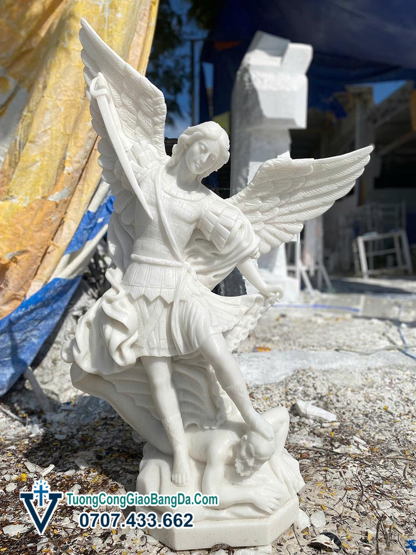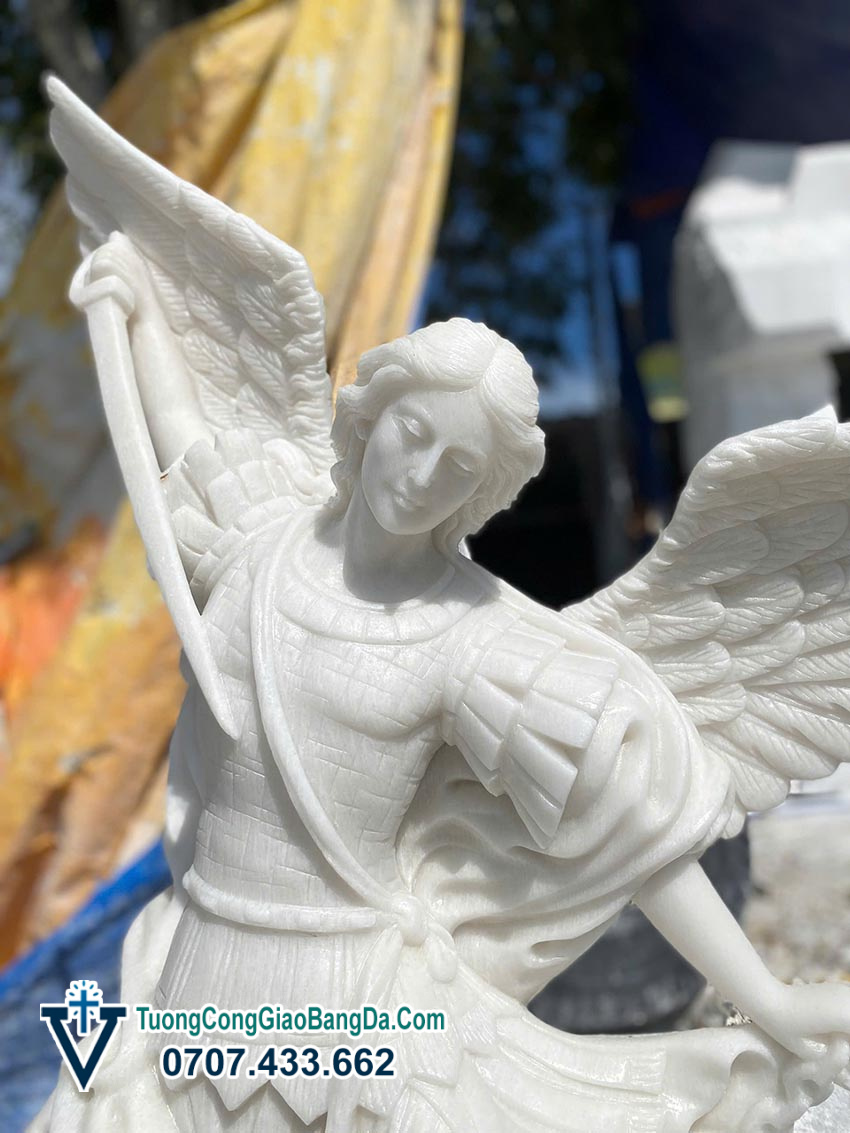Tượng Tổng Lãnh Thiên Thần bằng đá cẩm thạch trắng là mẫu tượng Công Giáo mang hình ảnh mạnh mẽ, uy nghi, thể hiện quyền năng và sứ mệnh bảo vệ của các Tổng Lãnh Thiên Thần trong đức tin Kitô giáo. Tượng được điêu khắc thủ công tại xưởng điêu khắc tượng Công Giáo bằng đá Văn Vĩnh, nổi bật bởi độ tinh xảo và thần thái sống động.